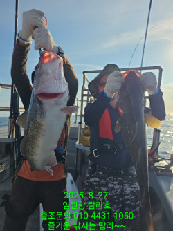 세분 모시고 왕대구 출조 다녀왔습니다 일찍부터 느나느나 에 싸이즈도 대박 8시 철수 하여 입항중 입니다 한분은 쿨러를 두개나 가지고 오셨네요 그래도 전원 싸이즈 좋은 놈을 만쿨 했습니다 자리 여유가 많습니다 대구 잡으러 오셔요 *** 삼척 탐라호 예약 안내 ***예약문의 : 010-4431-1050오시는길 : 강원도 삼척시 원덕읍 임원 항구로34-24홈페이지 : https://tamra.sunsang24.com/